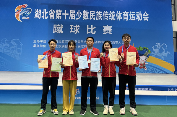 本网讯 2023年4月18日到4月22日,湖北省第十届少数民族传统体育运动会在宜昌市举行。公司民族式摔跤代表队获得一金三银七铜的优异成绩,蹴球队获得二等奖和三等奖,伟德bv1946官网李志鸿老师获优秀教练员称号。