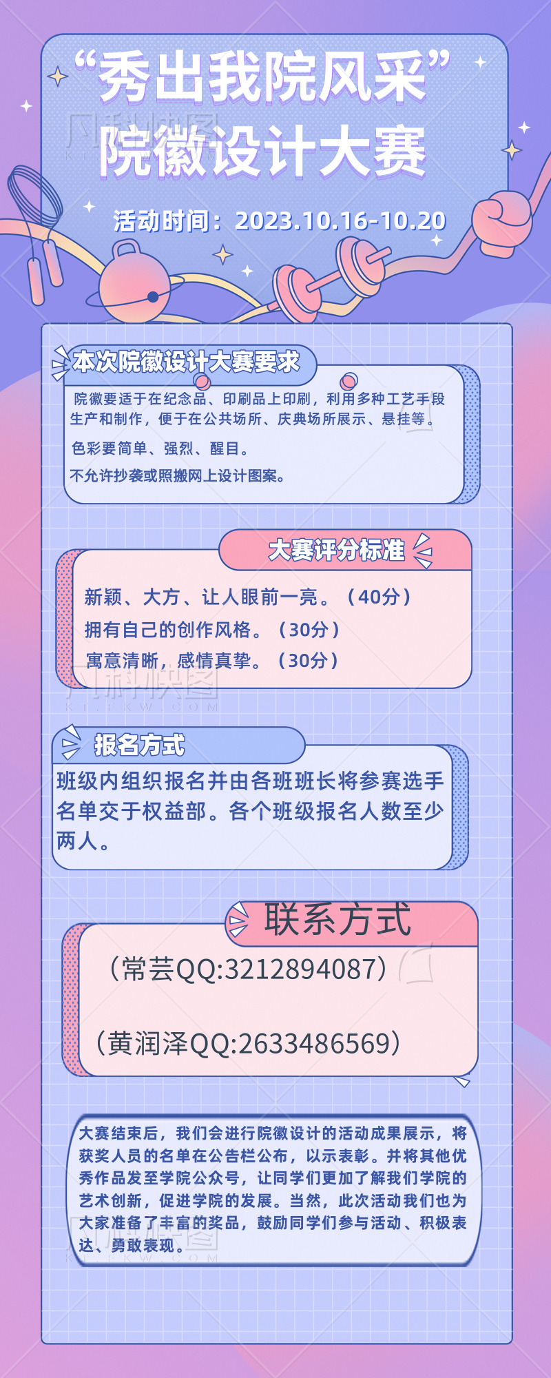 看到这里了相信你已经对“秀出公司风采”院徽设计大赛有了初步的了解,心动不如行动,还等什么!即日起至10月20日下午六点之前以班级为单位将报名表发送至权益部负责人邮箱即可!我们不见不散!
