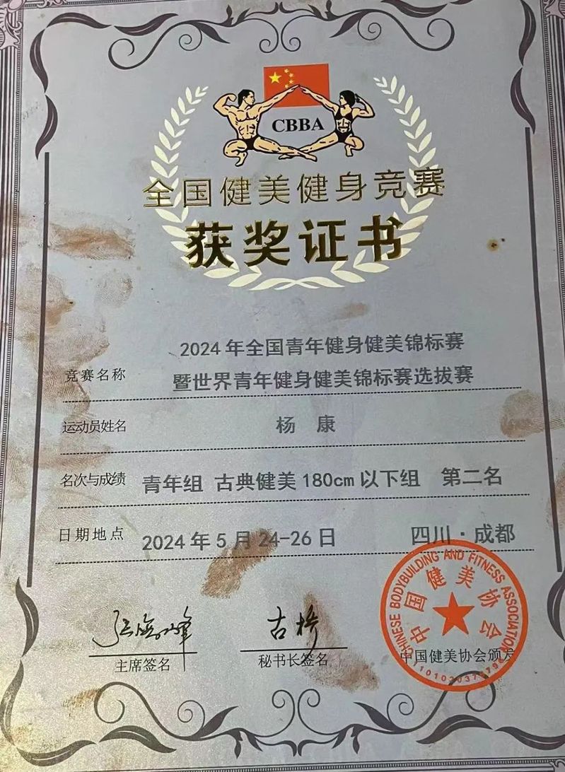这是杨康第五年代表学校参加健身健美类赛事,期待有更多的同学加入到这个项目之中,为校争光!