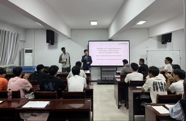 座谈会后,吴應洙教授在学院三楼学术报告厅奉献了一场前瞻性讲座——《第四次工业革命浪潮下与体育产业的应用、FunEball全民运动》。他深入剖析了AI智能分析、VR沉浸训练、物联网设备联动等前沿技术如何深刻解构并重塑传统体育形态,为全民健身普及与竞技体育突破提供双向革新动力。讲座现场互动频频,师生提问踊跃,浓厚的学术思辨氛围贯穿始终。
