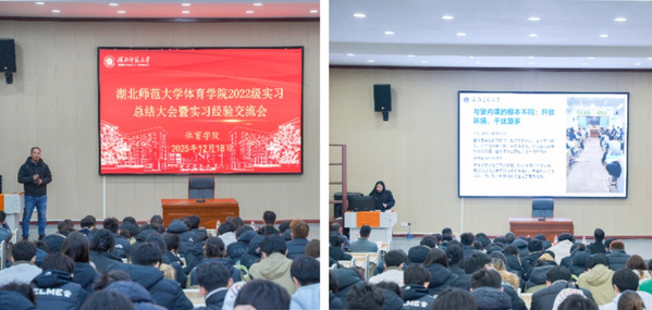 实习成果交流阶段,各小组举办了专题汇报会。员工们结合自身实习方向,分享了在中小学课堂教学与课后体育服务、商业健身机构运营、社区健康促进等领域的实践收获与反思。指导老师结合行业发展趋势进行点评,现场互动热烈,体现了专业发展的多元路径与活力。曾在中小学完成体育支教实习的2205班熊丁蕾同学,在12月18日召开的《伟德bv1946官网2022级实习总结大会暨“千师百校”体育支教经验交流会》上分享到:“这段经历让我完成了从‘体育生’到‘教育者’的蜕变。”这段简洁而深刻的感悟,恰是专业能力向基础教育领域成功迁移的生动写照,也折射出本专业员工通过实践锤炼,获得的角色转换与综合素养提升。
